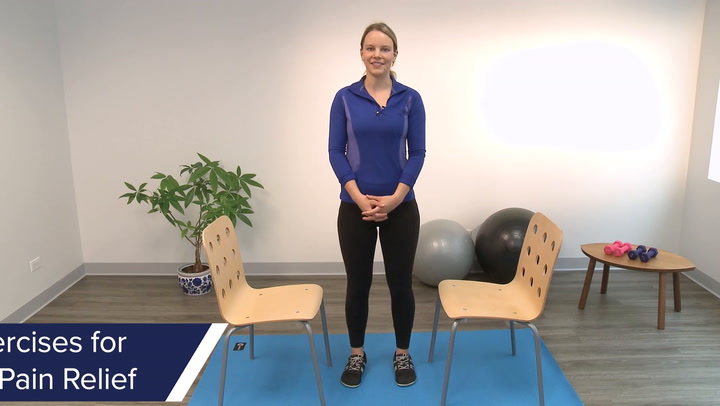 Hola a todos. Soy Natalie y hoy Veritas Health le ofrece cinco ejercicios fáciles para aliviar el dolor lumbar. El primer ejercicio es un estiramiento del tendón de la corva sentado. Se sentará en una silla y colocará el talón en una silla frente a usted, manteniendo la espalda recta. Usted girará hacia adelante en sus caderas hasta que se sienta un estiramiento suave a través de la parte posterior de su muslo. Puede mantener este estiramiento durante al menos 15 segundos, trabajando hasta tres veces en cada lado. Otra forma en que se puede realizar un estiramiento de isquiotibiales es contra una pared o un atasco de puerta. Usted se acostará boca arriba con una pierna recta y luego una pierna apoyada contra una pared. Puede mantener este agradable estiramiento relajante hasta por un minuto, trabajando hasta tres veces en cada lado.