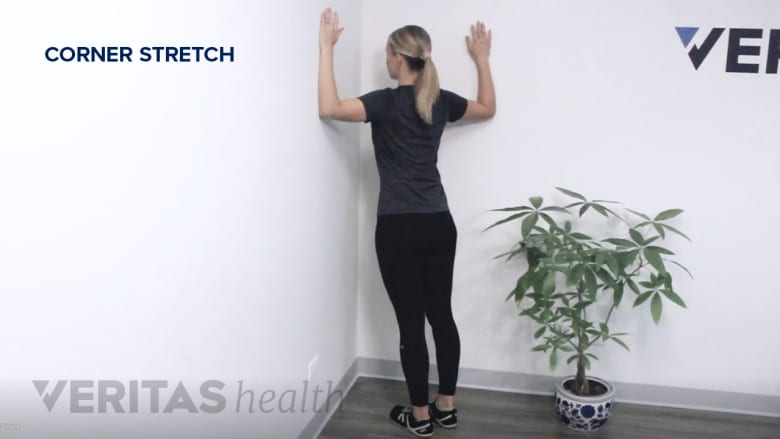 If a corner is not available, another option is to perform this stretch in a doorway by placing the forearms on the door jambs (sides of the door frame). This stretch can be performed 3 to 5 times throughout the day.