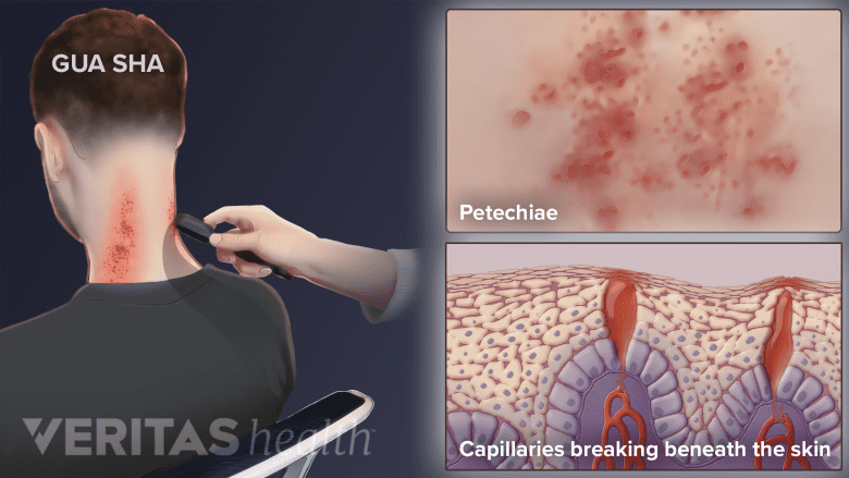 Gua sha may look strange or appear painful to observers who are unfamiliar with this treatment. When a practitioner press-strokes the skin with a rounded edge during gua sha, the tiny blood vessels (capillaries) beneath the skin can break. This process makes the skin develop red spots (petechiae) and looks like a rash or bruise. The size and darkness of the resulting spots can vary greatly, depending on the patient’s condition as well as the practitioner’s skill. The redness usually goes away within 2 to 4 days.
