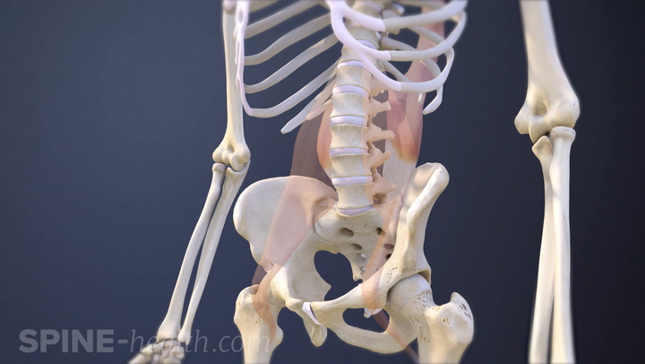 The flexors lie in the front of the lumbar spine. The main muscle in this group is the psoas major, a spindle-shaped muscle, which extends from the transverse processes of vertebrae T12 to L4 to the upper part of the thigh bone.