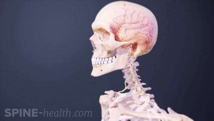 The spinal cord starts at the base of the brain, runs throughout the cervical and thoracic spine, and typically ends at the lower part of the thoracic spine.
