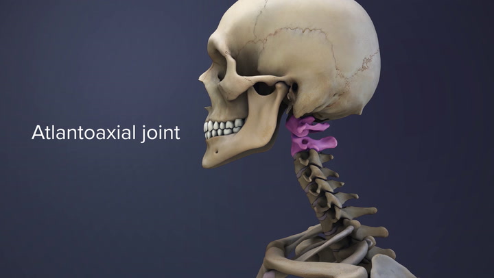 The C1 and C2 vertebrae are connected in the back by a pair of facet joints. The ring-shaped atlas rotates around the dens, which is the peg-like bony projection of the axis.