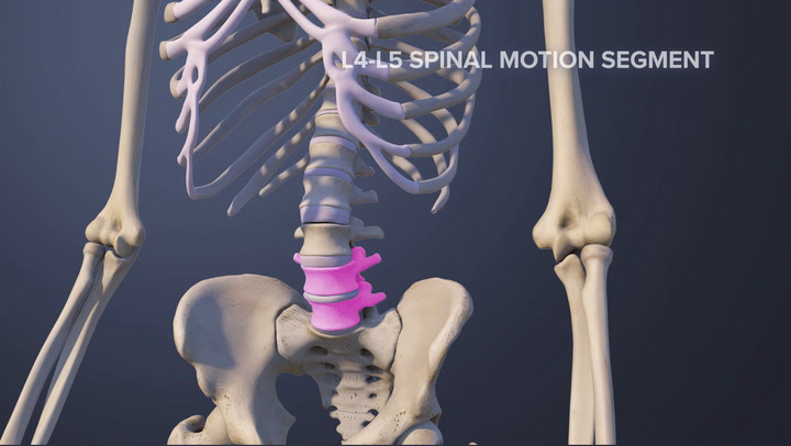 The L4-L5 spinal motion segment is located in the lower portion of the lumbar spine and consists of L4 and L5 vertebrae, and the anatomical structures connecting them. This segment helps provide flexibility to the trunk and low back, supports the upper body, and protects the cauda equina and nerve pathways.