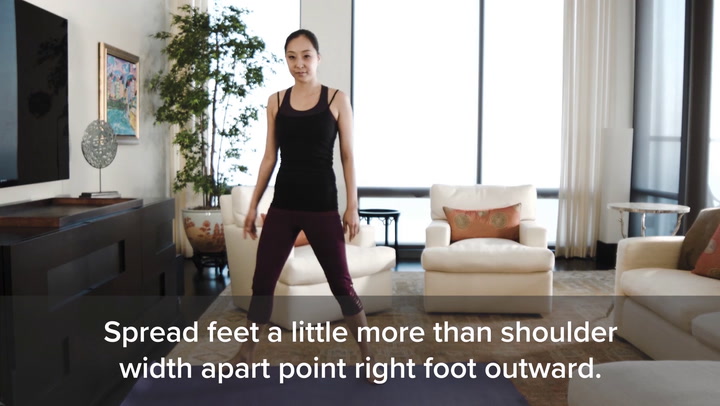 - Spread feet a little more than shoulder width apart and point the right foot outward.